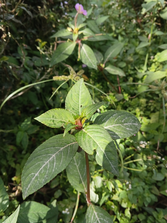 The image presents a close-up view of vegetation located in Buyantashi, Zambia. The primary subject is the upper portion of a green plant, centered in the foreground. This plant exhibits multiple ovate leaves with serrated margins and distinct white venation. The central stem is reddish-brown, with new growth visible at the apex. Some leaves show minor marginal irregularities and small perforations. The background consists of a densely blurred assortment of green foliage, indicating an outdoor, natural environment. Among the background plants, a single pink flower is discernible in the upper left, and spiky seed heads are present in the mid-ground. The scene is illuminated by natural daylight, casting varying shadows and highlights across the plant structures. No human figures or discernible actions are present.