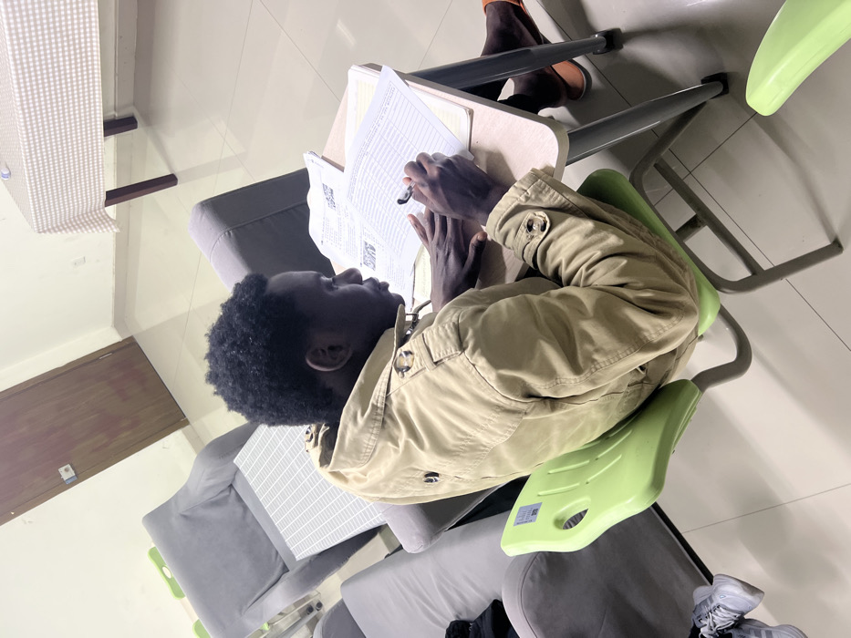 This image depicts an indoor setting within Jiangjin, China. A single individual, identified as a male with dark skin and short, dark, curly hair, is seated at a light-colored wooden desk with grey metal legs. He wears a light brown or beige jacket with large decorative buttons and orange slip-on sandals. His right hand holds a black pen, poised over white paper displaying printed text and blank entry lines. His left hand rests on an adjacent document. The individual is seated on a light green plastic chair with a grey metal frame, facing right relative to the viewer, with his gaze directed downwards towards the papers. The floor is covered with light-toned tiles, and the walls are light-colored. In the background, several grey upholstered armchairs are arranged, flanking a small square table with a light grey grid pattern top. Further back, a light brown wooden door with a silver-colored handle is visible. To the right, a rectangular table covered with a white and light brown checkered tablecloth holds a white bottle. The scene is illuminated by bright, overhead artificial lighting, casting visible shadows.