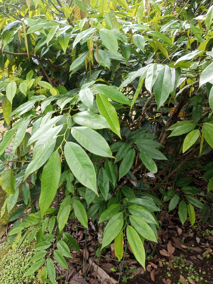 The image displays dense green foliage from a plant or tree, located outdoors in Kanand, India. The foreground and mid-ground are filled with numerous ovate to lanceolate-shaped leaves, primarily in shades of medium to dark green, with some exhibiting lighter green or yellowish-green hues, and a few showing reddish-brown tips indicative of new growth. Vein patterns are discernible on many leaves. Branches and stems are partially visible, mostly obscured by the leaf clusters. The ground at the base of the plant consists of dark soil, scattered dry brown leaves, and sparse small green vegetation. Multiple slender, dark green support stakes or rods are vertically positioned in the lower-middle and lower-right sections of the frame, partially covered by foliage. Natural daylight illuminates the scene, creating soft highlights on the leaf surfaces. No people, animals, or explicit actions are visible.