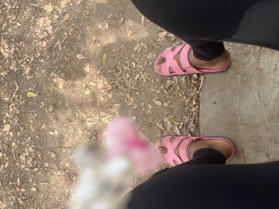 A top-down, first-person photograph depicts the lower body of an individual in an outdoor setting, likely in Nassarawa, Nigeria. The subject wears black trousers and pink, open-toed sandals with two broad straps forming an X-shape over the instep. Their feet rest at the edge of a light grey concrete surface. Beyond the concrete, the ground is composed of dry, light brown soil extensively covered with fallen brown leaves and scattered debris. A highly blurred object, appearing light-colored and possibly fluffy with a hint of pink, is held in the upper left foreground. Natural light illuminates the scene, creating soft shadows on the ground.