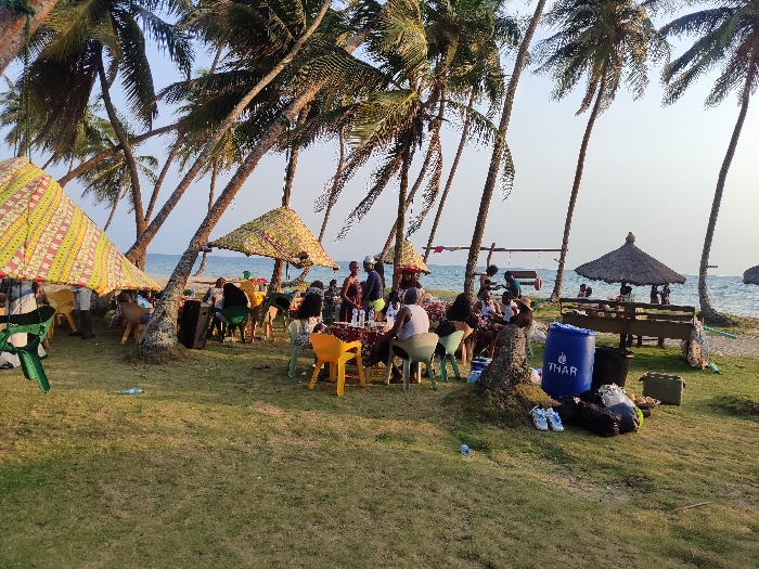 A group of people gathers on a grassy area near a beach with palm trees, enjoying a picnic or celebration. Colorful umbrellas provide shade over tables and chairs. A blue barrel with "THAR" printed on it sits next to personal belongings. A small gazebo can be seen further along the shoreline. The scene suggests a relaxed and festive atmosphere in a tropical setting.