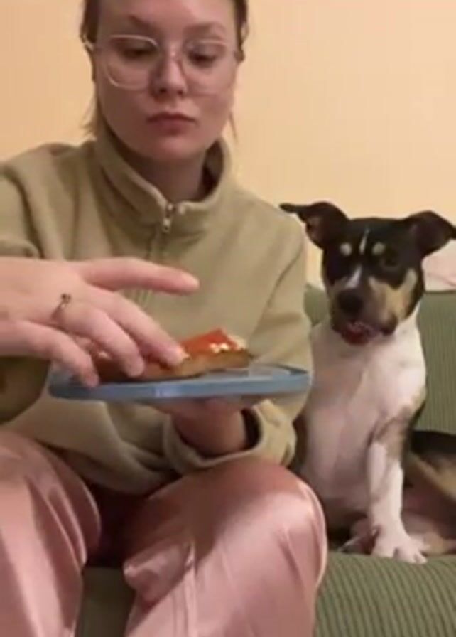 A fair-skinned woman wearing eyeglasses, a light green fleece zip-up jacket, and shiny pink pajamas sits cross-legged on a green couch. She is holding a small, light blue plate containing two open-faced sandwiches. Each sandwich appears to consist of a slice of bread topped with a white spread and red fish roe. The woman takes a bite of one of the sandwiches. To the right of the woman, a small dog with black, brown, and white fur is sitting and looking at the woman. The dog's tongue is partially visible. The background is a plain, light yellow wall.