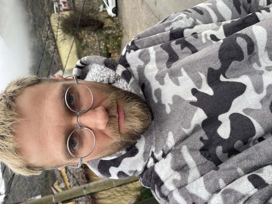 An individual is captured in a close-up, selfie-style outdoor portrait in Vranjina, Montenegro. The subject is an adult male with short, light blond hair and a light brown, full beard. He wears round, thin-rimmed silver-colored glasses, through which his blue eyes are visible, looking directly at the camera with a neutral expression. He is dressed in a grey, black, and white camouflage-patterned hooded sweatshirt made of a plush, soft fabric, with a white sherpa-like fleece lining visible inside the hood. The background, out of focus, reveals elements of the city environment. To the left, a dark utility pole or tree trunk stands vertically. In the mid-ground, multiple buildings are visible; one on the left features yellow-painted walls and a dark roof, while another on the right also has a dark roof. A white passenger car is parked on a road to the right. The far background shows mountainous terrain partially obscured by mist or low-hanging clouds, indicative of an overcast day.