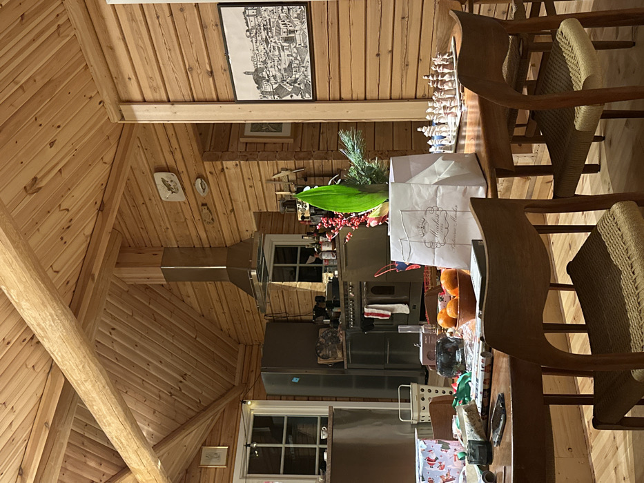 A rustic, wood-paneled kitchen is visible, with a high, angled ceiling supported by exposed beams