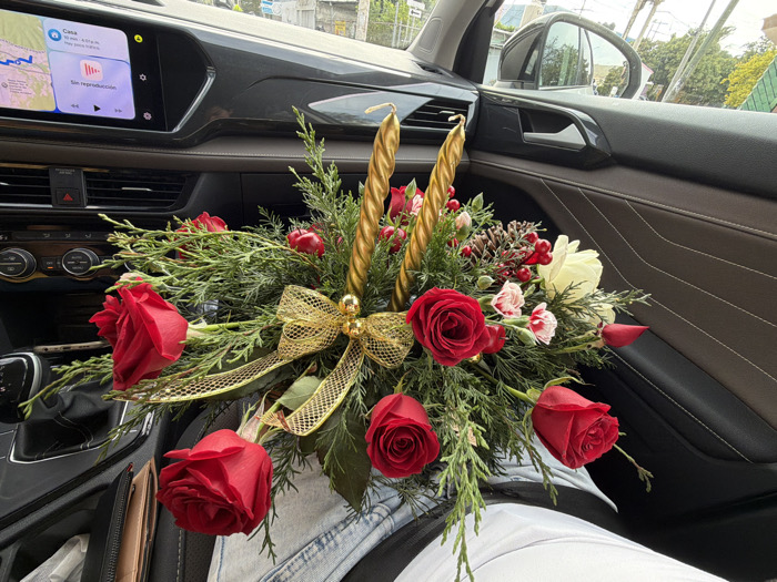 Inside a car, a festive floral arrangement sits on the lap of someone wearing white pants and light-wash jeans. The arrangement features red roses, greenery, small red berries, and a few white and red carnations. Two tall, gold-colored candles stand upright in the center, and a gold ribbon with beads is tied around the base. The dashboard and infotainment screen of the car are visible in the background.