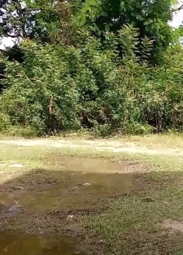 muddy, grassy area with puddles. In the background, there is a dense row of trees and bushes. The sky is visible above the trees. The camera appears to be stationary.