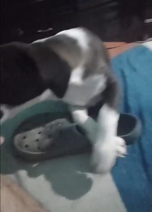 - "black and white dog laying on a pair of gray Crocs" by FM-WujkC2, licensed under CC BY 4.0