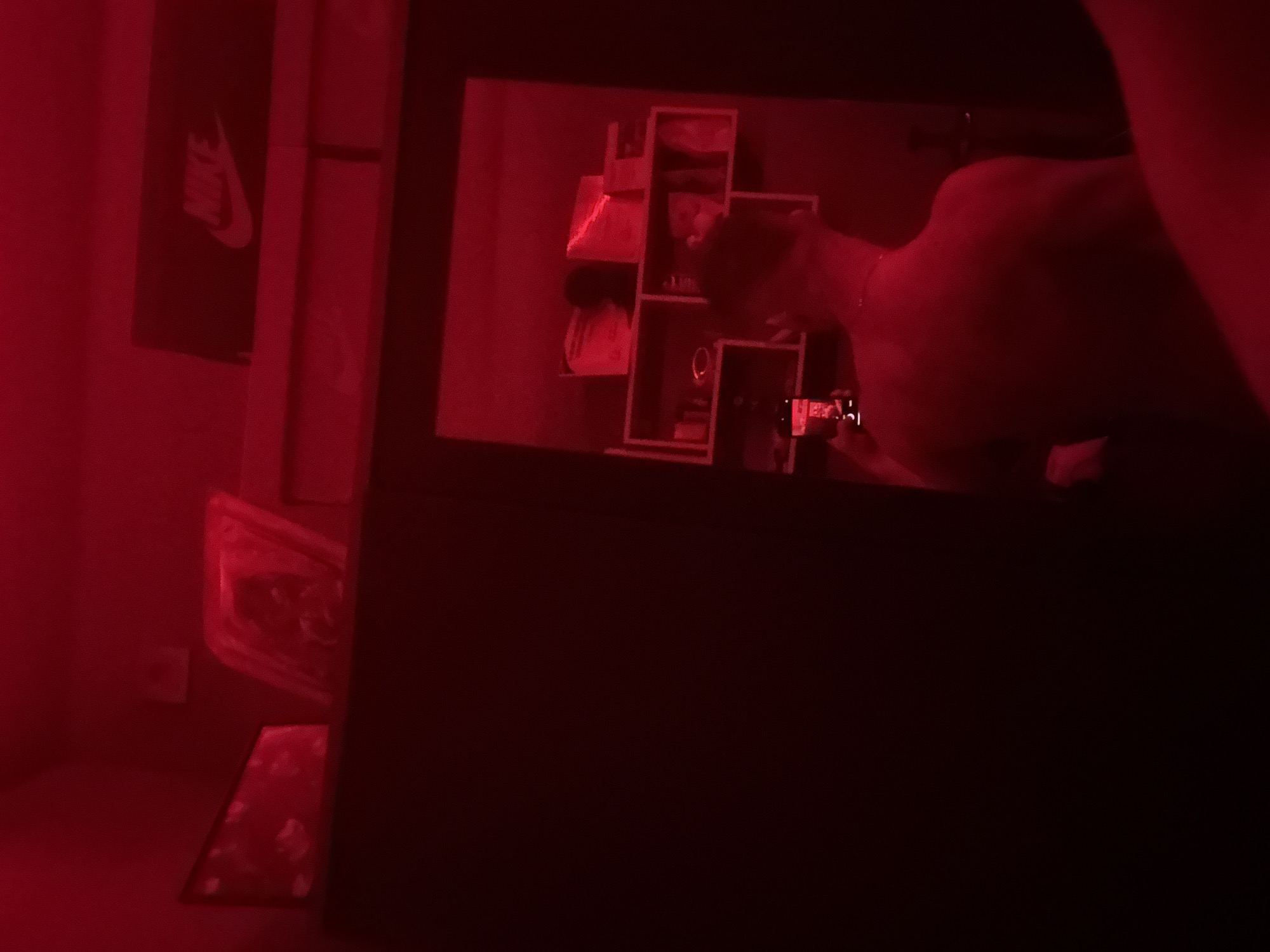 A person is seen in a red-lit room, seemingly in front of a mirror