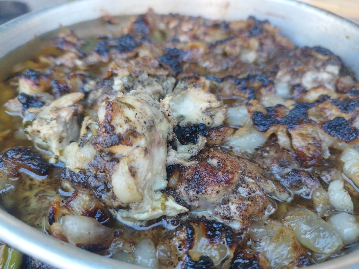 The image displays a close-up, overhead view of cooked food contained within a round, metallic pan. The pan's light grey rim is visible along the edges. The primary components of the dish are numerous irregularly shaped pieces of cooked meat, possibly chicken or lamb, varying in size from approximately 2 to 5 centimeters. These pieces exhibit a range of colors, including off-white, light grey, and brown, with significant portions displaying dark charring or blackening, indicating grilling or roasting. Dark specks, consistent with ground pepper or other seasoning, are visible on many pieces. Interspersed among the meat pieces are translucent, white to pale yellow, amorphous globules and fragments, which appear to be rendered fat or very soft, cooked onions. All components are submerged in a shallow pool of yellowish, oily liquid. No individuals, direct actions, or specific environmental details beyond the immediate pan are discernible within the frame. The location within the city of Hebron, Palestinian Territory, cannot be determined from the visual evidence provided in this image.