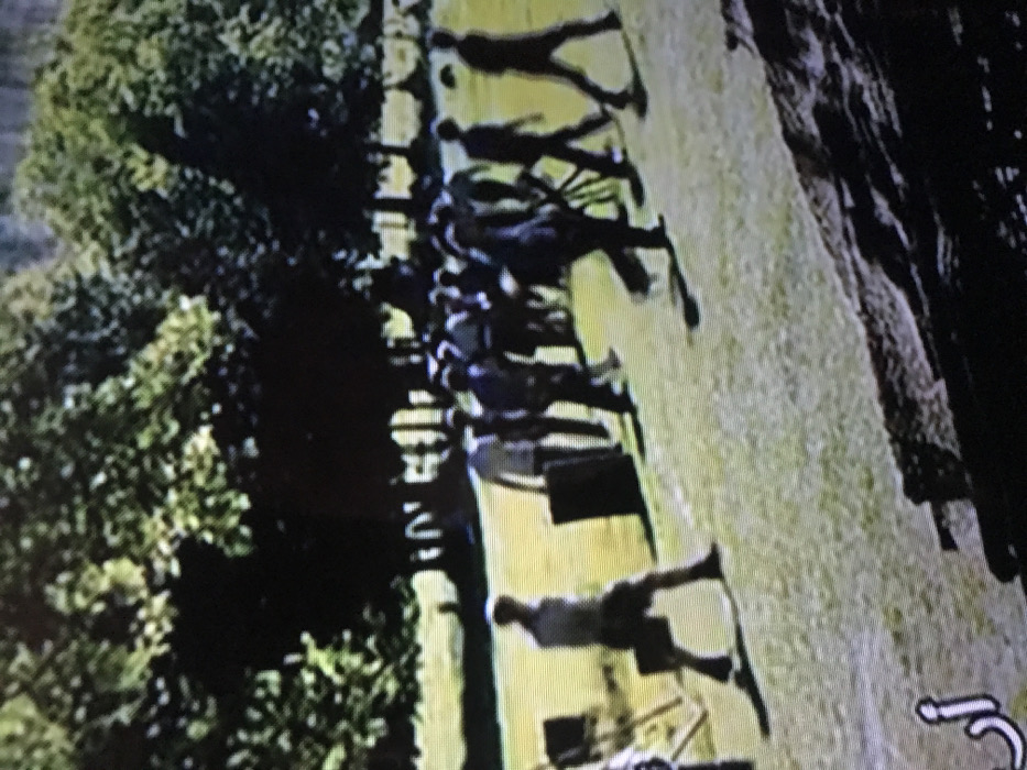 The scene depicts an outdoor environment in Ankpa, Nigeria, under daylight conditions. A group of approximately 15 to 20 individuals, appearing as adults, are walking across a grassy field. A line of large, densely foliated trees forms the background. In the mid-ground, a person on the left carries a dark, rectangular briefcase in their left hand. To their right, a dark, rectangular object, possibly a large suitcase or box, stands on the ground. Several individuals in the central part of the group are carrying or handling pole-like objects. The individuals are dressed in a mix of light-colored tops and dark bottoms or entirely dark clothing. Their shadows are visible on the grass, indicating direct sunlight. The immediate foreground features a dark, irregularly shaped object, possibly wood or rock, in the lower right, and a partial white Arabic character "أ" in the lower left. No direct interactions between individuals are discernible, beyond their collective movement.