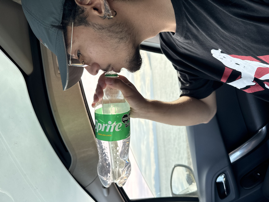 A male individual is observed from the right side, seated inside a vehicle in Municipio de Tolhuin, Argentina. He wears a reversed dark grey baseball cap, gold-rimmed eyeglasses, and has a trimmed beard. His visible left ear features two gold hoop earrings and a silver-colored stud in the upper cartilage. He is clad in a black short-sleeved t-shirt displaying a white and red graphic, consistent with the Ghostbusters logo. The individual is actively drinking from a clear plastic Sprite bottle with a green label and a green cap, containing a clear liquid. The label displays "SABOR LIMA-LIMON" and an "EXCESO SODIO" warning octagon. The bottle is approximately half full. Through the vehicle's passenger side window, a large body of water, identified as Lago Fagnano, is visible under a bright, partly cloudy sky, with distant mountains or landmasses on the horizon. The vehicle's interior shows a beige A-pillar trim, a dark grey dashboard, and a dark grey door panel with silver handle accents.