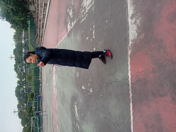 A woman in a long black coat and red sneakers stands on a weathered tennis court. The court is marked with faded green and red paint, separated by a white line. Behind her, trees line the edge of the court, and bleachers are visible in the background. The scene appears to be outdoors on an overcast day.
