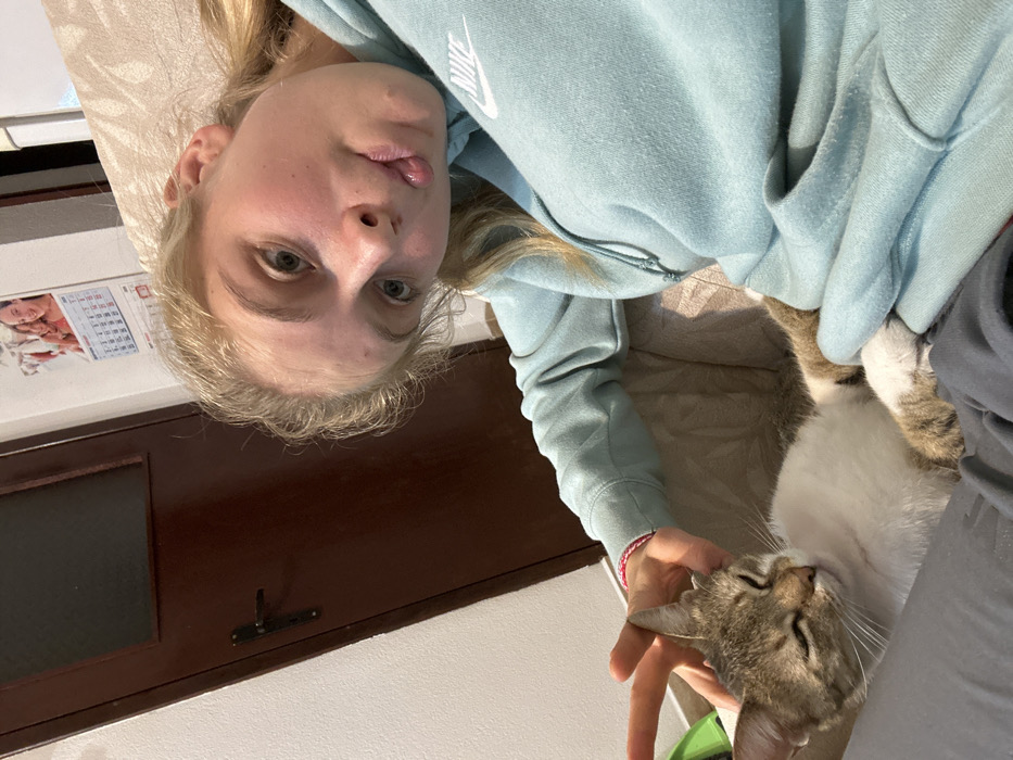 A young female individual is depicted indoors in Cherniche, Bulgaria, in a close-up, angled selfie. She has light-colored hair and is wearing a light blue hooded sweatshirt with a white Nike logo on the chest. Her eyes are open, directed towards the camera, and her lips are pursed with her tongue slightly visible. Her left hand is extended, petting a domestic short-haired cat lying on her lap/legs. The cat is predominantly white with tabby markings on its head and back, and its eyes are partially closed in a relaxed state. The female is seated on a beige, patterned furniture piece, possibly a sofa or bed. In the background, a dark brown wooden door with a rectangular opaque glass panel and a dark handle is visible on the left. A white wall extends from behind the door, featuring a calendar with images of individuals mounted on it. The overall scene suggests a casual, domestic interaction between the female and the cat.