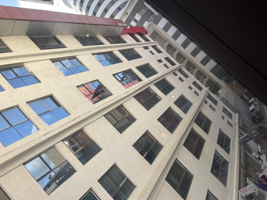 An upward shot views a tall, beige building with rows of square windows reflecting a bright, cloud-filled sky. Some windows are dark, offering views inside, including one showing a glimpse of a red structure. Adjacent to the right is a taller white building with curved horizontal lines. The scene includes a view of the street below, featuring parked cars, motorcycles, and shop signs. The photo is taken from an elevated position behind a window.