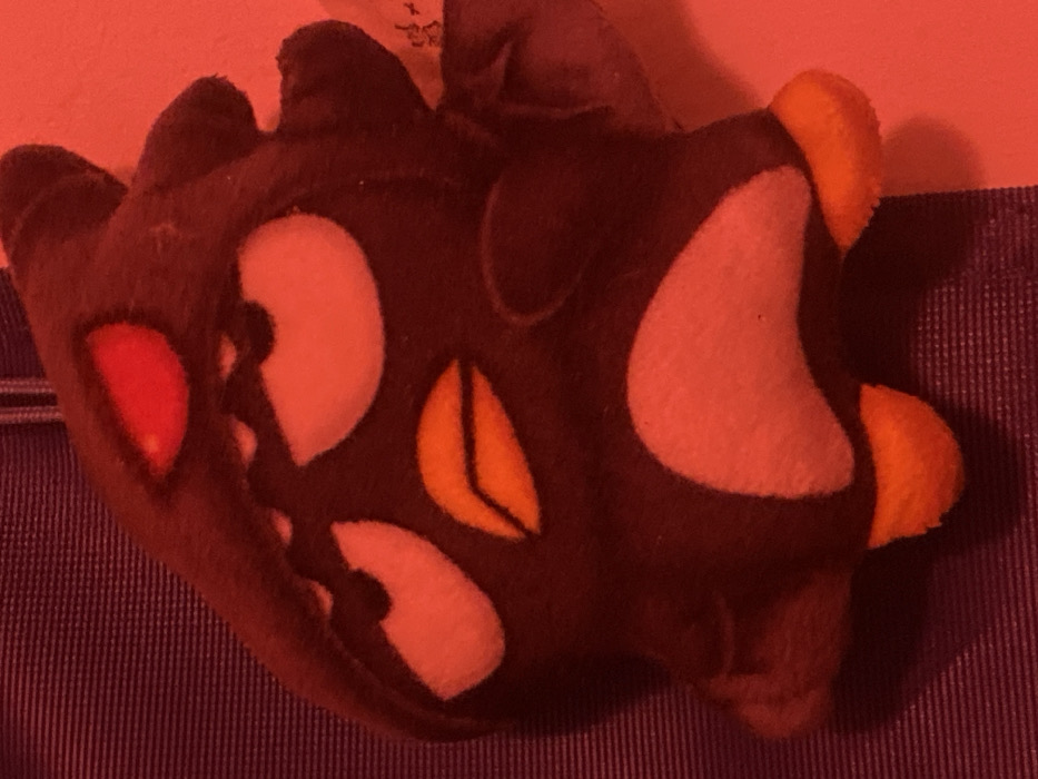 A plush, possibly toy, resembling a creature with dark-brown fur. The plush has distinct facial features including a red eye, two white semi-circular shapes suggesting eyes, and a yellow triangular shape. It seems to have rounded extensions, possibly ears or fins, tipped with orange. The item is on a surface with a textured pattern, bathed in an overall red color cast.