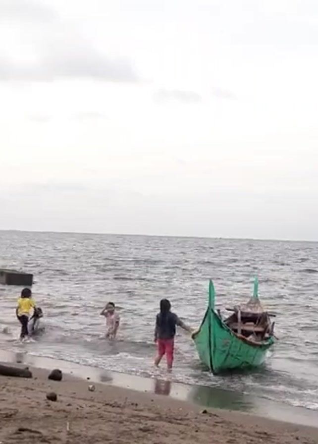 The scene depicts a group of children playing on a beach next to a small, green boat