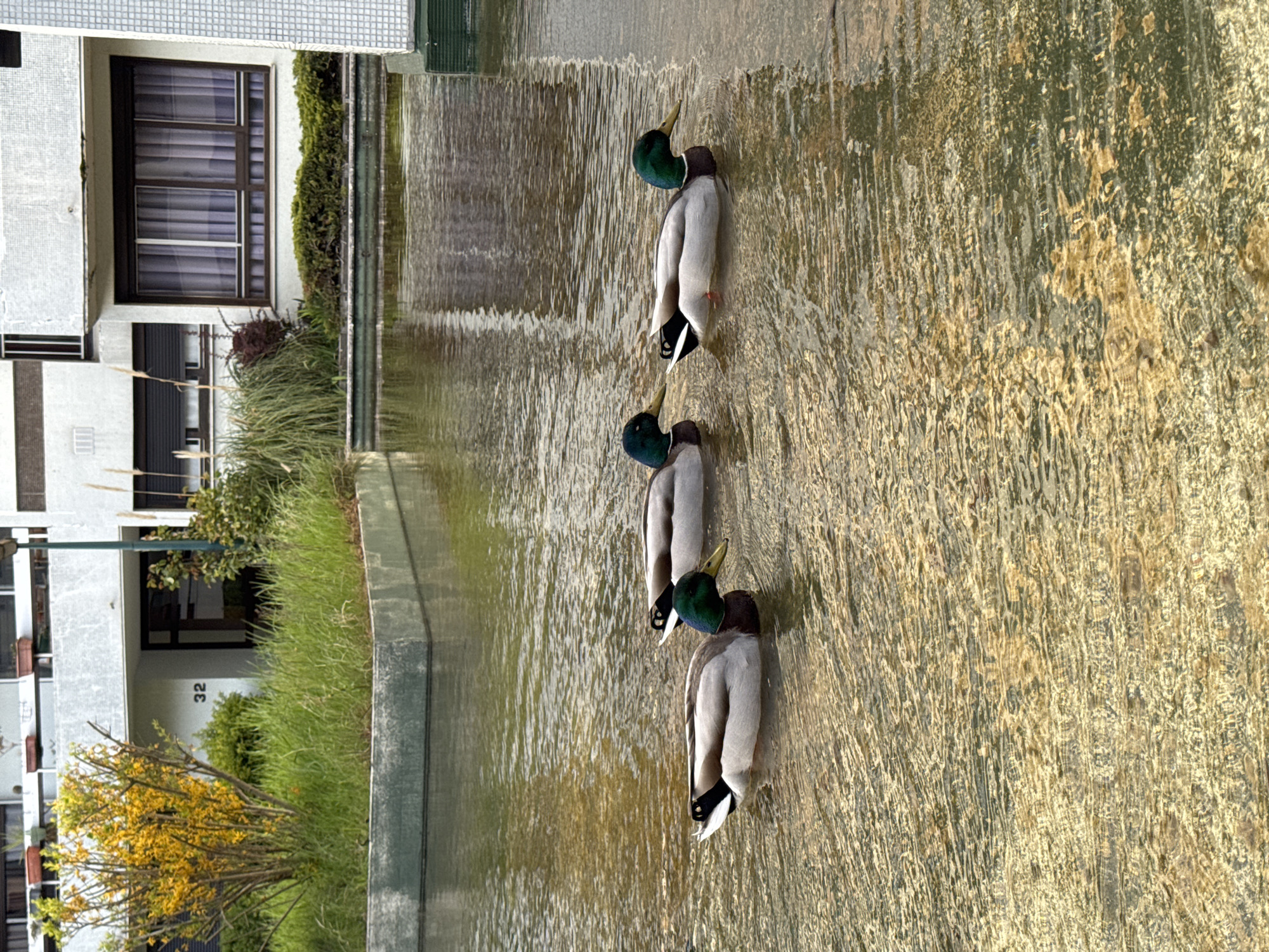 Three male mallard ducks are observed swimming from left to right across a shallow, rippling body of water, which displays a golden-green hue. In the background, a multi-story building with a white tiled facade features dark-framed windows, some with light-colored curtains drawn and external roller shutters. The building entrance on the ground floor is marked with the number "32". Landscaping separates the water from the building, including an elevated section of overgrown grass, a prominent yellow-flowering bush to the left of the entrance, and various green shrubs. Additional potted plants are visible on a balcony railing of the building. A dark vertical pole is partially visible on the right side of the frame. The scene is located in the city of Les Ulis, France.