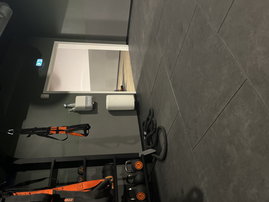 The image displays an indoor fitness facility in Hérouville-Saint-Clair, France. The room features dark gray walls and a floor composed of large, dark gray rubber tiles. On the left, a black, multi-tiered shelving unit holds various fitness items, including several black kettlebells, with visible orange weight markings of "20" and "24" kilograms, and other black bags or small weights. Above and to the right of the shelving unit, black and orange suspension training straps hang from a ceiling-mounted hook. A coiled black battle rope rests on the floor directly in front of the shelving unit. On the dark gray wall to the right of the fitness equipment, a white wall-mounted dispenser is visible, topped with a hand sanitizer pump bottle and a spray bottle, positioned above a roll of white paper towels. Directly beneath this dispenser stands a white, cylindrical waste bin or container. Further to the right, an open doorway leads into an adjacent room, which has a lighter, possibly wooden, floor and walls painted white above a gray lower section. A green, illuminated emergency exit sign, depicting a running figure, is affixed to the wall above the doorway. No individuals are present in the depicted scene.