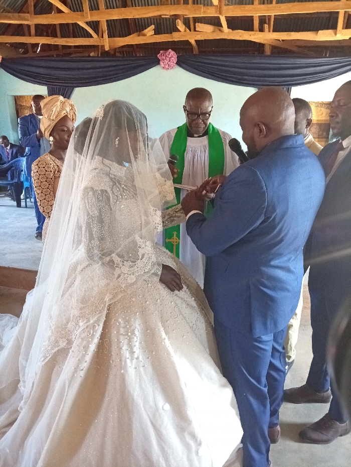 A wedding ceremony is depicted indoors in Kerang, Nigeria