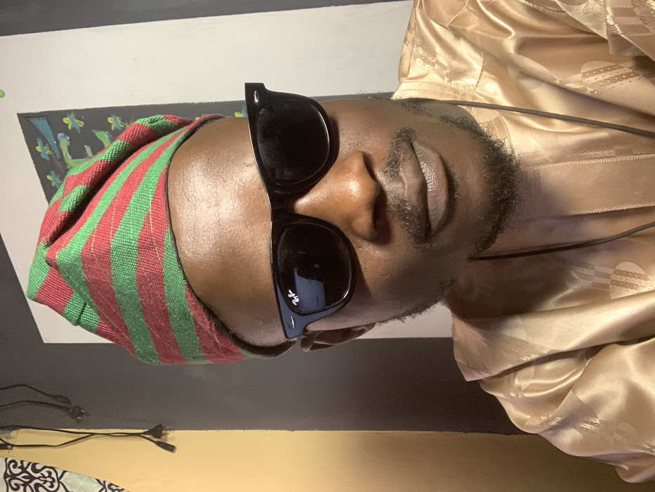The image features a dark-skinned male subject in a close-up, chest-up orientation. He is wearing a traditional cap patterned with alternating red and green horizontal stripes, and black Wayfarer-style sunglasses, with the "Ray-Ban" logo visible on the left lens. A short beard or stubble is present on his chin and upper lip. He is dressed in a light brown or golden-colored traditional garment, possibly an agbada, which exhibits a subtle woven pattern. A thin black cord is visible around his neck and descends over his garment. The subject is looking towards the camera. The background consists of a segmented wall: a light yellow/beige section on the left, with black cables hanging vertically and a fragment of light blue and white patterned fabric or wallpaper at the top left corner. A dark gray/black wall section occupies the right side, displaying a partial view of a framed artwork featuring abstract blue, yellow, and green shapes against a dark background. The specific location within Jos, Nigeria, is not identifiable from the visual information presented in the image.