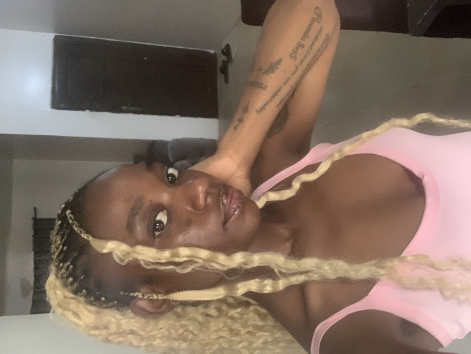 A single individual, appearing female, with dark skin, is depicted from the chest up in an indoor setting. She wears a light pink tank top. Her hair consists of long, blonde, curly extensions styled into a high ponytail, with several wavy blonde strands framing her face and intricate braids near the scalp. Her left hand (viewer's right) rests behind her head/neck. Multiple lines of text are tattooed on her left forearm. The background features light-colored walls. A dark brown, closed door with a handle is visible in the upper right, positioned above two dark-colored slippers resting on a light-colored floor. Blurred furniture is discernible in the distant background. The specific location within Ogombo, Nigeria, is not visually identifiable from the provided image.