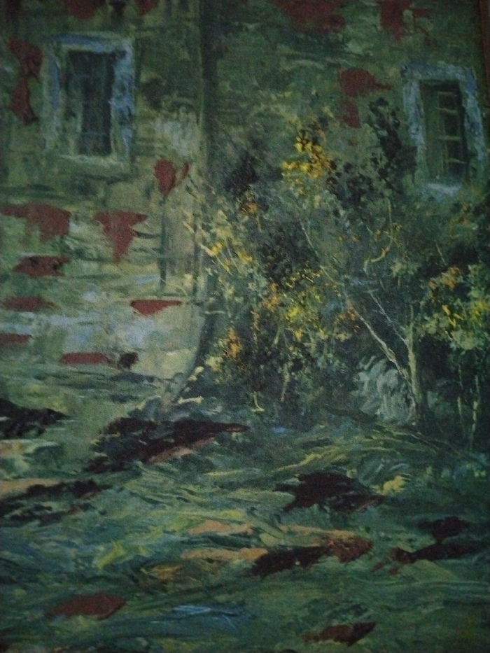 An impressionistic painting depicts a weathered building partially obscured by foliage