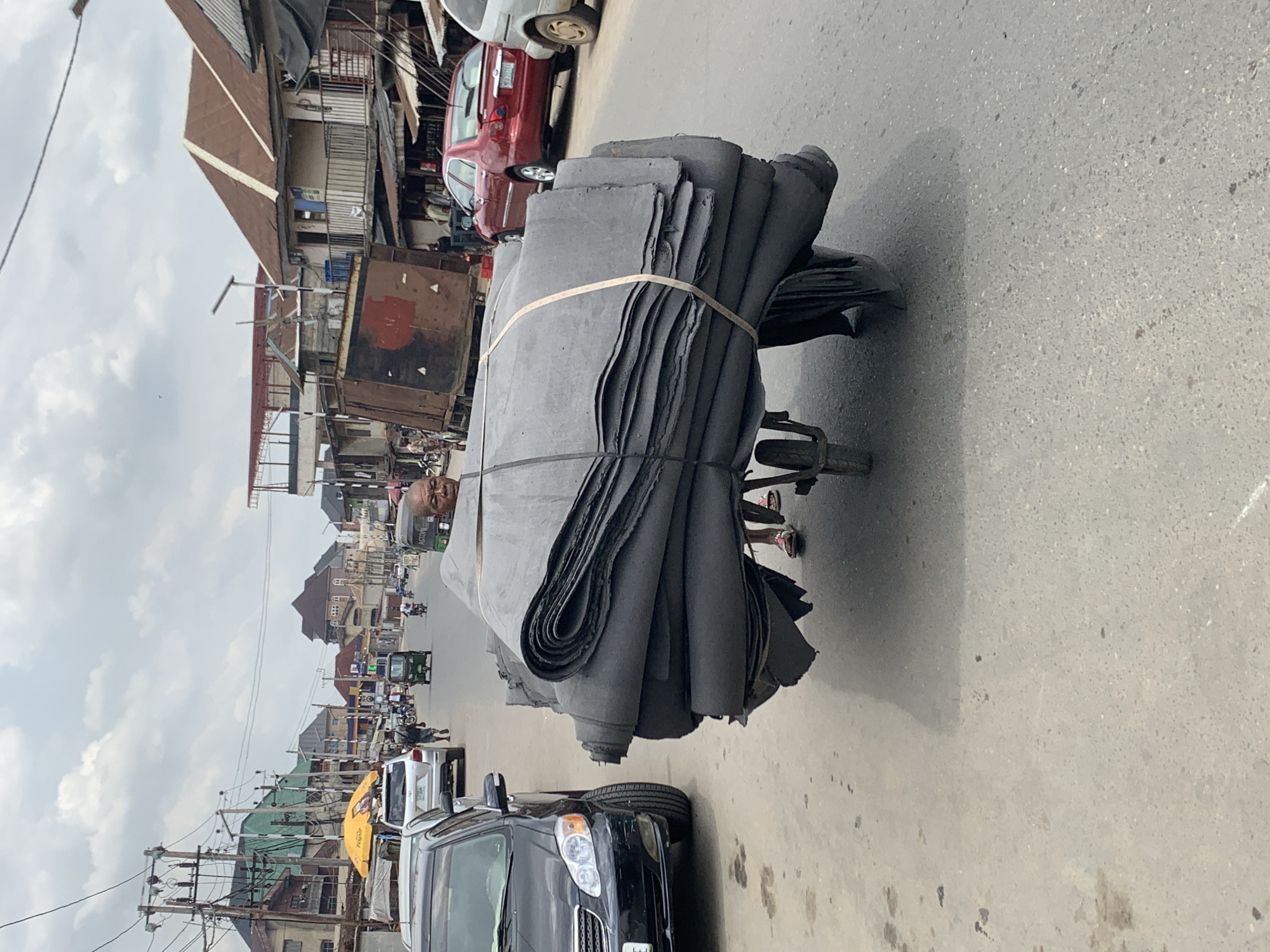 The scene depicts a bustling street in Aba, Nigeria, under an overcast sky. In the foreground, an adult male, with dark skin and a bald or shaven head, wearing a dark t-shirt, is positioned centrally on an asphalt road. He is actively pushing or pulling a two-wheeled handcart that is heavily laden with a large stack of dark grey or black, rolled or folded sheets of flexible material, secured with a lighter-colored strap. The man's gaze is directed forward, making eye contact with the viewer. To the left of the central figure, a black sedan is partially visible, parked or moving slowly. Further down the street on the left, a silver SUV is parked near a yellow market umbrella, and a green three-wheeled vehicle is in motion. Utility poles with power lines and transformers are prominent along the left side of the street. On the right side of the road, a red sedan is parked, facing away from the viewer, followed by a partially visible white van. Further in the background, a large, dark brown cargo container or truck is present. The street is lined on both sides by multi-story buildings, exhibiting various architectural styles and roof types, including corrugated metal in shades of brown and green, suggesting a mix of commercial and residential structures. Numerous pedestrians are visible throughout the midground and background, moving along the street and sidewalks. The road surface is asphalt, showing signs of wear.