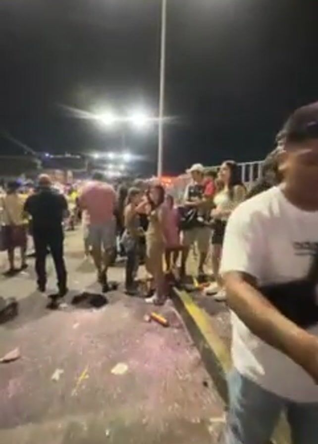 crowd of people gathering at night, likely for a festival or event. They are standing on a street illuminated by streetlights, with a metal fence on one side and buildings in the background. The ground is covered with confetti and other debris. The people are dressed in a variety of casual clothing, some are talking and others are moving through the crowd. There is a percussion band playing music in the distance.