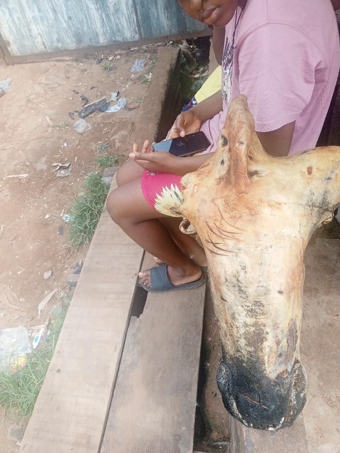 The scene is located in Onitsha, Nigeria. A person with dark skin, wearing a pink t-shirt, red shorts with a yellow floral pattern, and dark grey slip-on sandals, sits on a bench constructed from two rough wooden planks. The individual holds a black smartphone in both hands, with their gaze directed downwards towards the device. Resting vertically on the wooden bench to the person's right is a large, light brown, processed animal head, consistent with a bovine, exhibiting a dark, possibly charred or heavily smoked snout area. The ground surface is uneven reddish-brown dirt with sparse patches of green grass and scattered litter, including plastic debris. A discolored and somewhat oxidized corrugated metal wall or fence forms the background. No direct interactions between individuals are depicted.