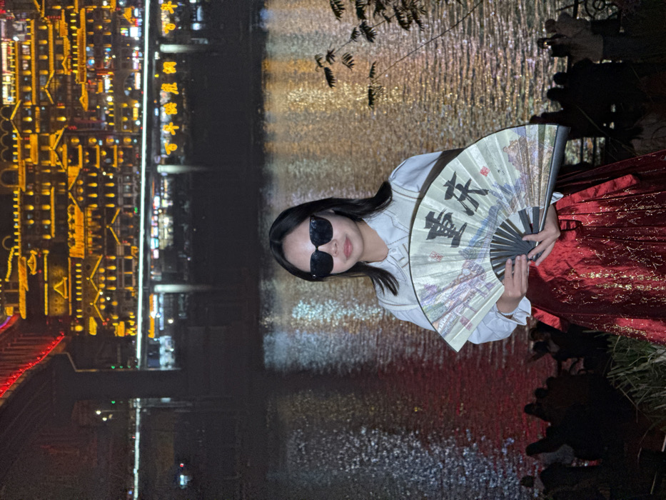 - "A young East Asian female stands centrally in the foreground of a nighttime scene along the Jialing River, viewed from the bank in Jiangbeicheng Subdistrict, Chongqing, China" by FM-K0Kp62, licensed under CC BY 4.0