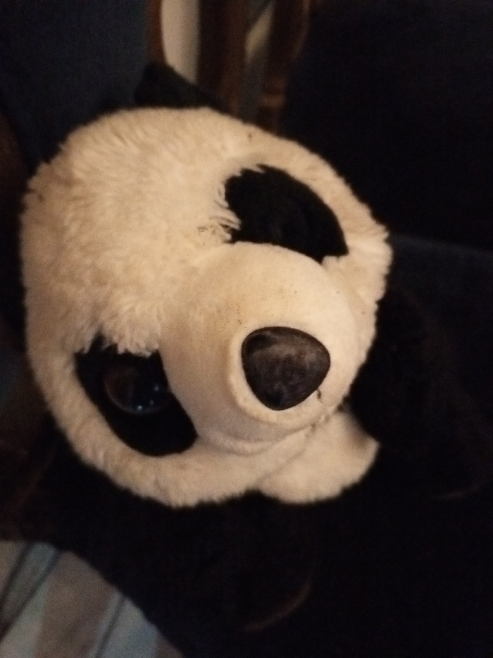 A plush panda toy dominates the frame, its head positioned at an angle
