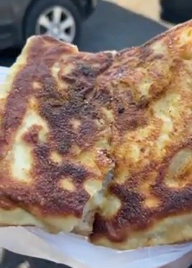A close-up shot shows a person holding a square-shaped pastry in a white paper wrapper. The pastry has a golden-brown, slightly mottled surface with darker patches. A small tear reveals a glimpse of the filling. The person's hand is covered by a black sleeve. In the blurred background, there are cars and tires in what appears to be an outdoor setting. The lighting suggests it is daytime.