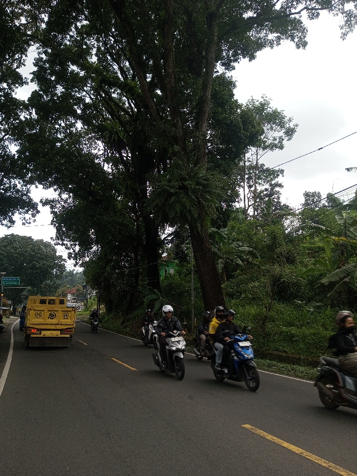 The image depicts a roadway scene in Daringbadi, India, under an overcast sky. A two-lane asphalt road, marked by a broken yellow centerline, features a yellow dump truck on the left side, positioned facing away from the camera. Ahead of the truck, a green directional sign with white text is partially visible on the left shoulder. On the right side of the road, a procession of at least five motorcycles or scooters travels away from the camera. The lead scooter, light-colored, carries a single rider wearing a white helmet and dark jacket. Behind this, a dark-colored scooter is occupied by two individuals, the front rider wearing a yellow jacket and dark helmet, the passenger wearing a dark jacket and dark helmet. Another dark blue scooter also carries two riders, both wearing dark helmets and dark clothing. All visible riders are equipped with helmets. The environment is heavily vegetated, with large, tall trees lining the left side and dense green foliage along the right, including epiphytic ferns on tree trunks. A white building with a green roof is partially visible through the trees on the right.