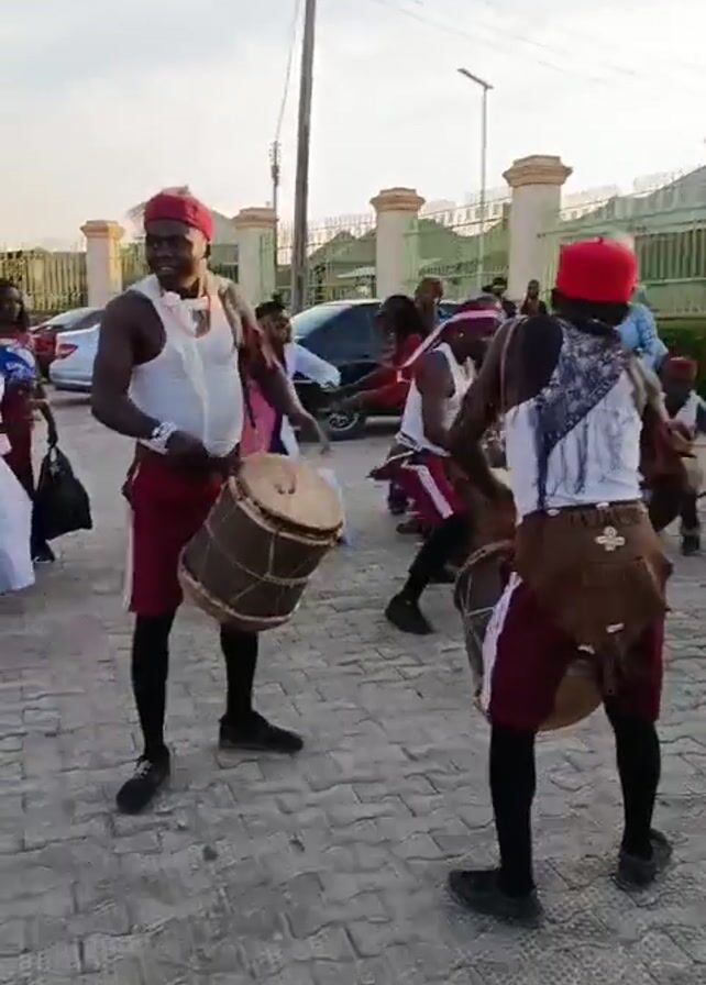 In a bright outdoor setting on a paved surface, a group of individuals are engaged in a lively drumming performance. The central figures are three men wearing red caps, white tank tops, and burgundy shorts with black leggings and shoes. Each man carries a large drum strapped to their body. They are beating the drums with enthusiasm, moving and dancing in sync with the rhythm. Several other people are visible in the background. Some are watching the performance, while others are casually walking by. Many are in colorful clothing. Cars can be seen parked behind a wrought iron fence. The sky is bright and somewhat overcast. In the background, there's a clear view of a residential area with well-maintained buildings and trees.