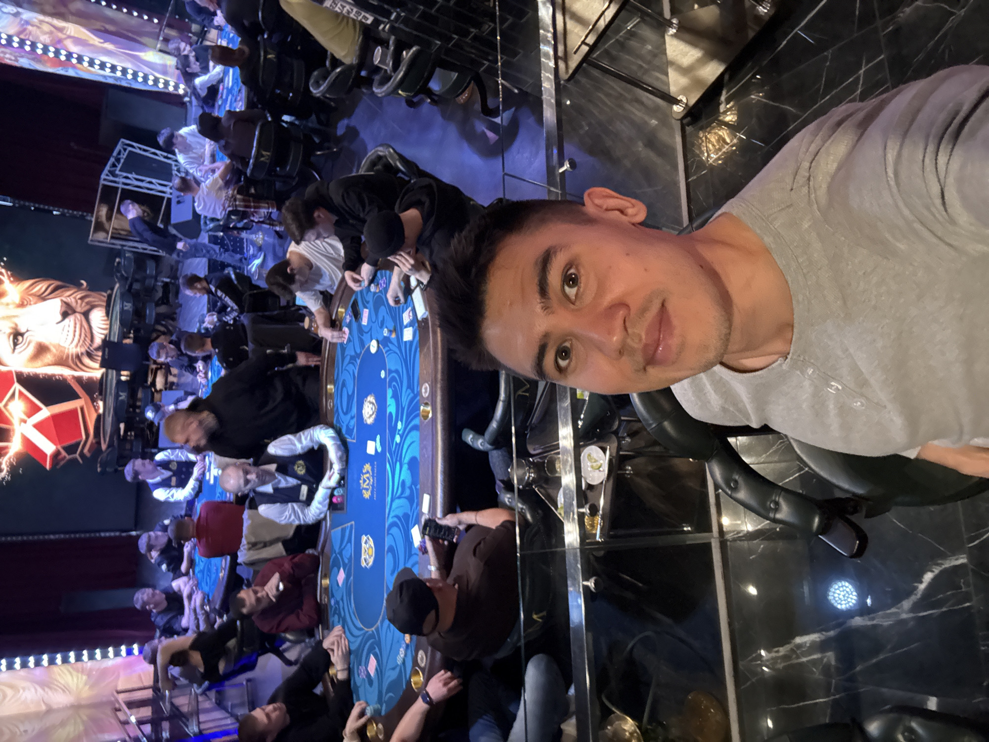 The image depicts an indoor scene within an active gaming establishment, located in Kazan, Russia. The foreground features a male individual taking a selfie, showing his face and upper torso. He has short dark hair and a light mustache, wearing a light grey Henley-style long-sleeved shirt. Below him, a dark marble-patterned floor with white veining is visible, reflecting ambient light. The midground is dominated by at least three oval-shaped gaming tables, characteristic of poker or card games, covered in blue felt with gold decorative patterns and an "M" logo. Approximately 20-25 individuals, primarily adult males, are seated or standing around these tables. At the central table, nine men are visible, some observing the game, others looking at their cards. One individual in a black cap is looking at a mobile phone. Another, in a maroon shirt, rests his chin on his hand. A man in a white shirt and dark vest, likely a dealer or game manager, is positioned at the table with stacks of chips. Various colored gaming chips and playing cards are distributed across the tables, indicating active play. Participants are engaged in observing, interacting, and playing the card game. The background consists of a large stage area with prominent LED screens. The central screen displays a large graphic of a lion's head alongside a stylized red, multi-faceted geometric object. Vertical light panels with rows of white lights flank these screens, set against dark red curtains or drapery. The environment is dimly lit, with specific illumination on the gaming tables and bright light from the display screens. Dark, high-backed chairs, some also bearing the "M" logo, are arranged around the tables.