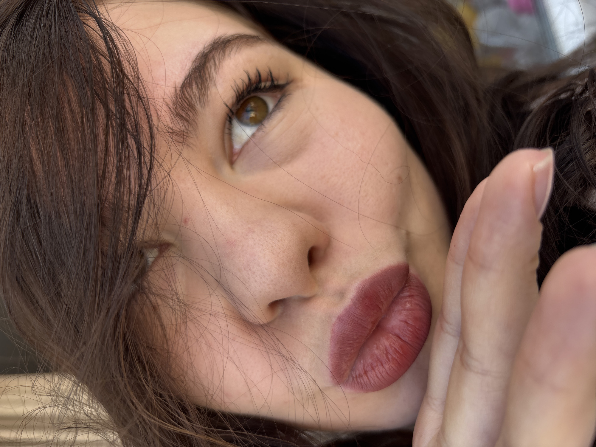 A close-up, angled portrait of an adult female is presented, reportedly from Perm, Russia. The subject's head is tilted right, with long, dark brown hair partially obscuring the upper left portion of her face. Her right eye, with a brown iris and visibly enhanced eyelashes, is directed towards the upper right. Her lips are pursed in a "kiss" or "pout" gesture, coated in a matte reddish-brown lipstick. A hand with fair skin and unpolished nails is positioned in the lower left, partially overlapping the area below her lips, consistent with a "blowing a kiss" action. Her skin exhibits pores on the nose and cheek, with a minor red dermal imperfection visible near the left eyebrow. The background is out of focus and indistinct, primarily displaying light, uniform tones.