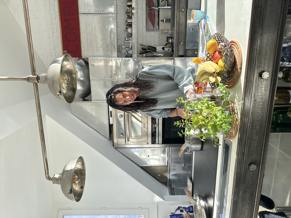 This image depicts a single individual engaged in food preparation within a modern, industrial-style kitchen, consistent with a renovated apartment in Paris, France, likely an upper floor or attic conversion given the sloped ceiling and window view