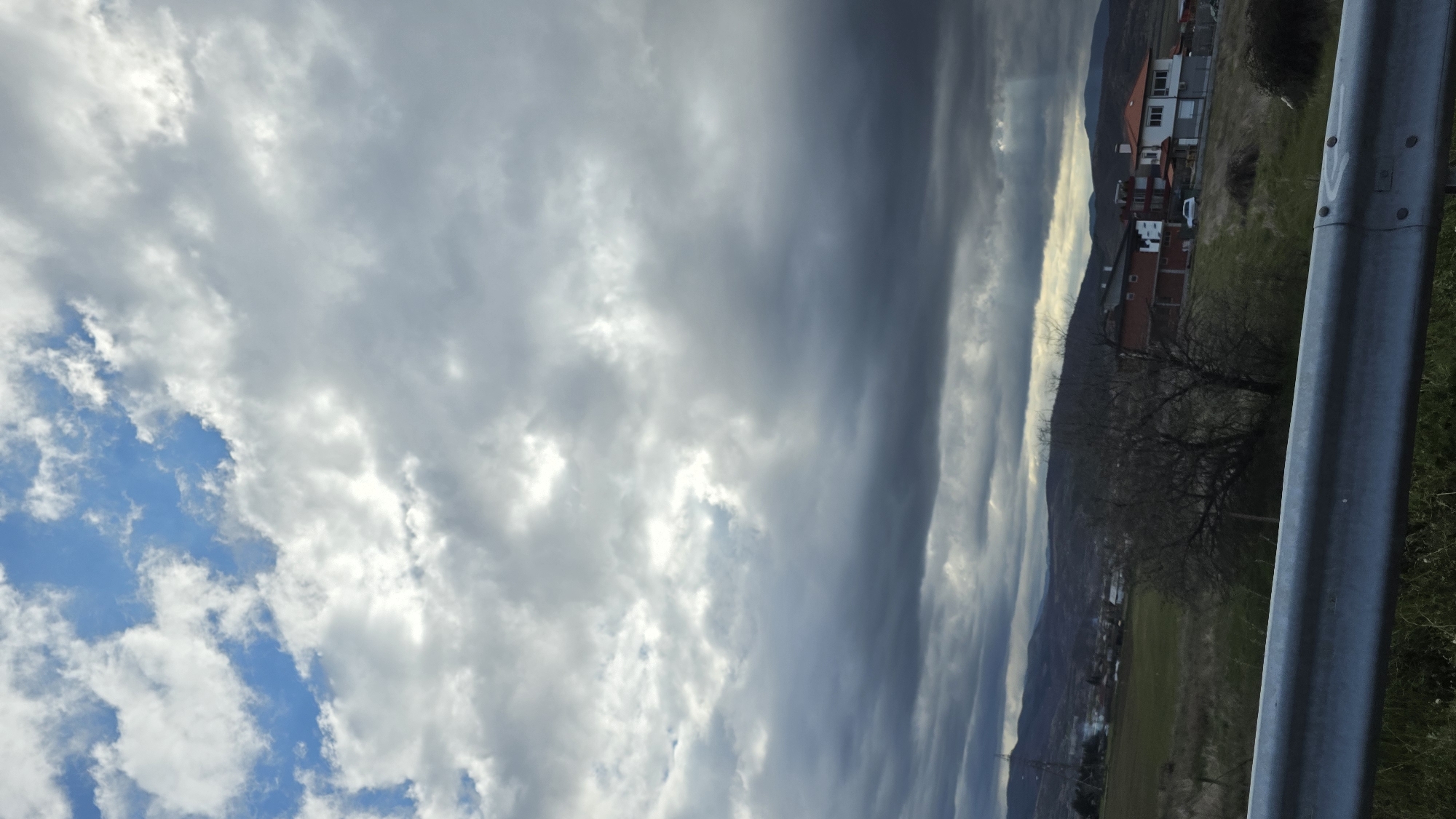 The image depicts a cloudy sky over the city of Blagoevgrad, Bulgaria. The sky is filled with a mix of light and dark gray clouds, with some patches of blue sky visible. In the distance, there is a line of mountains. The foreground features a metal guardrail, typical of a roadside. Adjacent to the guardrail is a patch of green grass. Beyond that are buildings of the city, trees, and an open field.