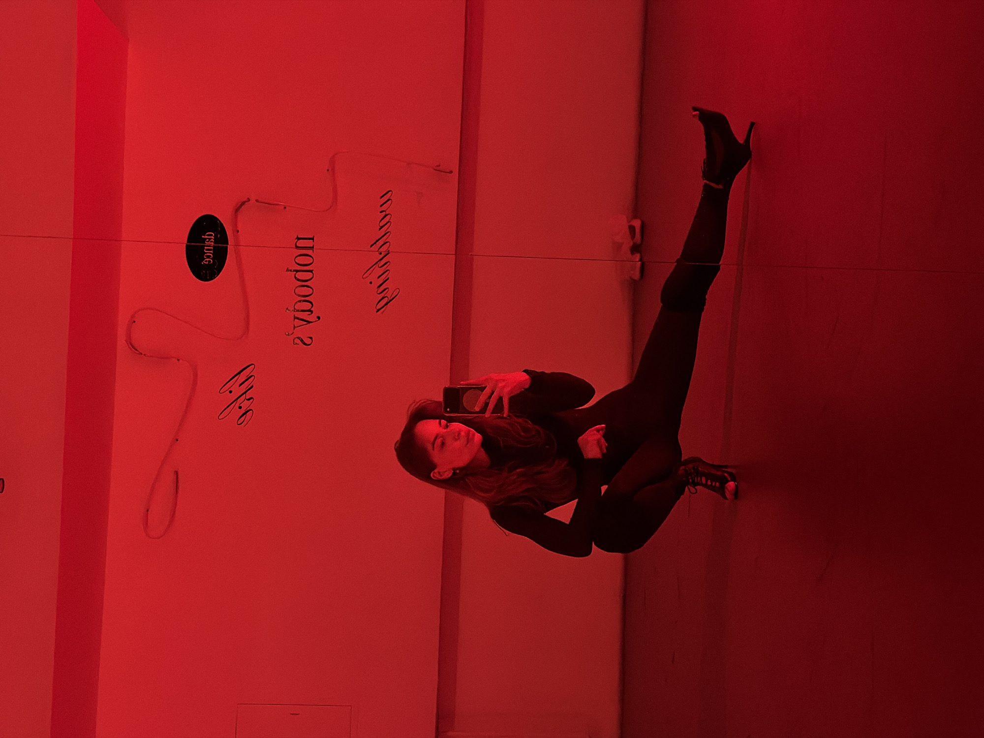 The image captures a young adult female posing for a selfie within a studio space at Ulitsa Usacheva, 2, Moscow, Russia, identified as a BINOD aerial dance and flexibility studio. The environment is uniformly bathed in intense red light, casting deep shadows. The female subject has long brown hair and wears a form-fitting, long-sleeved black bodysuit and black high-heeled ankle boots with light-colored toe caps. She is positioned in a low lunge, with her left leg bent and foot flat on the floor, and her right leg extended horizontally to the right, balanced on the toe of her boot. She holds a dark-colored smartphone in her right hand, aiming it towards her reflection in the mirrored wall to take a photograph. Behind her, reflected neon signs on the wall are visible, reading "BINOD" within an oval shape, followed by the words "nobody's" and "watching". A horizontal bar or ledge is present across the background wall, and the floor is a dark, reflective surface.