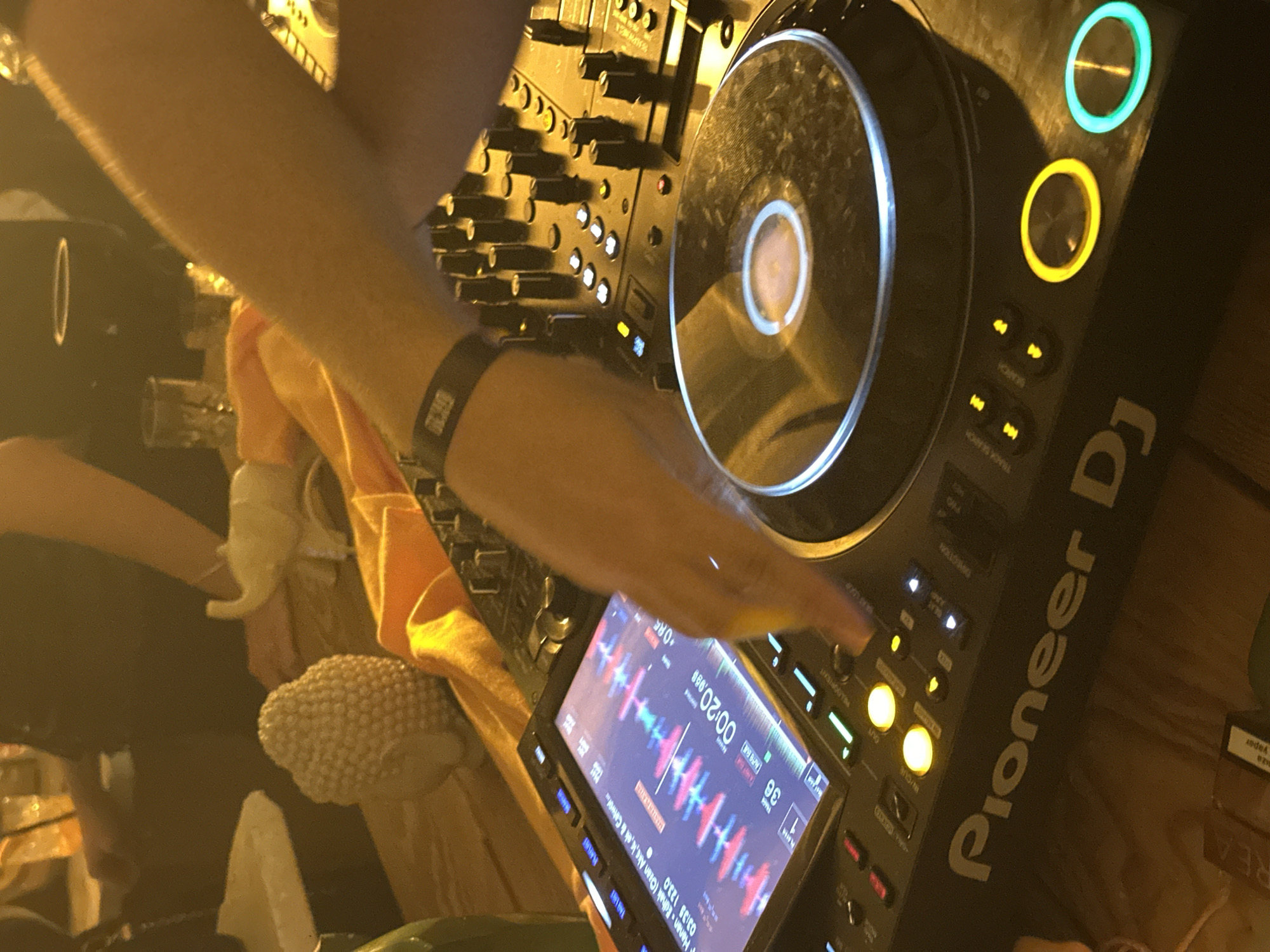 A slightly blurry, dimly lit, close-up shot shows a DJ operating a Pioneer DJ controller