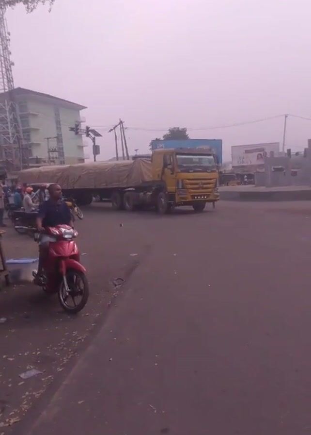 street scene during the daytime. The sky appears overcast and a large yellow truck with a covered trailer is slowly making a turn on the road. The truck is loaded with a tan-colored tarp covering the cargo. Several people are standing and sitting near the side of the road, with a few on motorcycles. A red motorcycle is parked prominently in the foreground. A multistory building can be seen in the background, along with traffic signals and utility poles. The general impression is a busy intersection in an urban or semi-urban area.