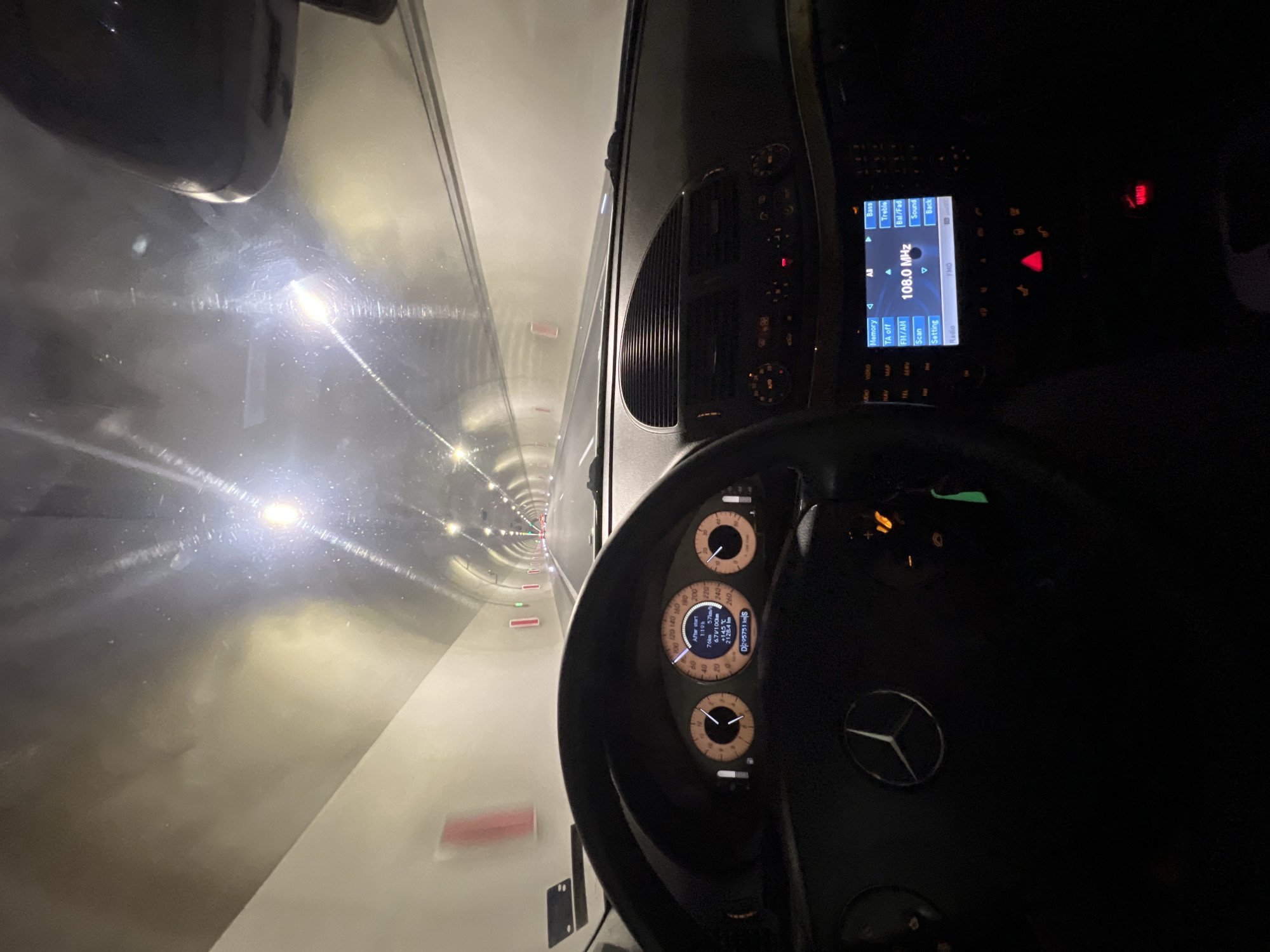 The image depicts the interior of a Mercedes-Benz car driving through the Jeleznitsa Tunnel in Jeleznitsa, Bulgaria