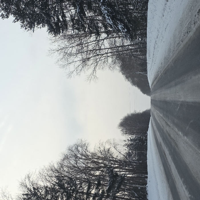 The image displays a two-lane asphalt road extending directly into the distance under an overcast, light grey sky within the general vicinity of the city of Foki, Russia. The road surface is partially cleared of snow, revealing darker, likely wet or slushy asphalt in the tire paths, while the shoulders and median (if applicable) are covered in accumulated snow and ice. Dense snowbanks line both the left and right sides of the road. Beyond these snowbanks, thick lines of trees, comprising both bare deciduous and snow-dusted coniferous types, flank the thoroughfare. The road appears to gradually ascend before disappearing over a slight crest in the horizon. No individuals, vehicles, or man-made structures are visible in the depicted environment, which indicates a winter season with cold, overcast atmospheric conditions.