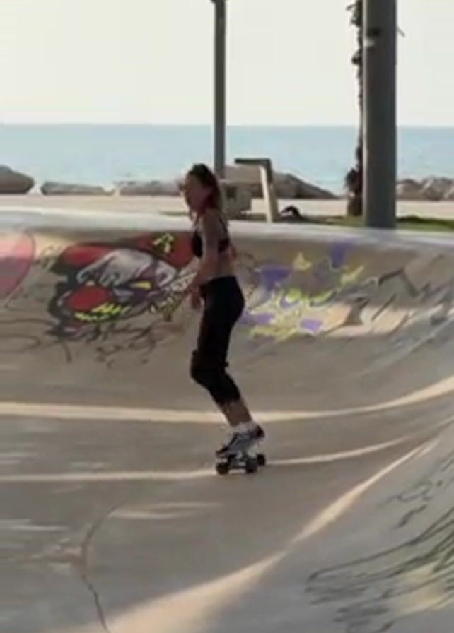 A woman in a black bra top and black leggings with knee pads is standing in a concrete skate park. She's near the edge of a rounded, bowl-shaped section of the park covered in graffiti. The graffiti includes a stylized heart design with an angry face. The woman is looking to her right, seeming to address someone off-camera, and appears to have just stepped off her skateboard, which is now stationary on the ground. In the background, beyond the skate park, is the ocean under a clear sky. A light pole and some palm trees are also visible. The scene is lit with soft sunlight, suggesting it's either early morning or late afternoon.