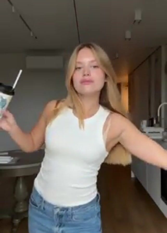 A young woman stands in a modern apartment wearing a white tank top and blue jeans. She holds up a white tumbler with a straw, takes a sip, and places her hand in her pocket. The apartment features neutral tones with a round table and a kitchen area visible in the background. The lighting is bright.