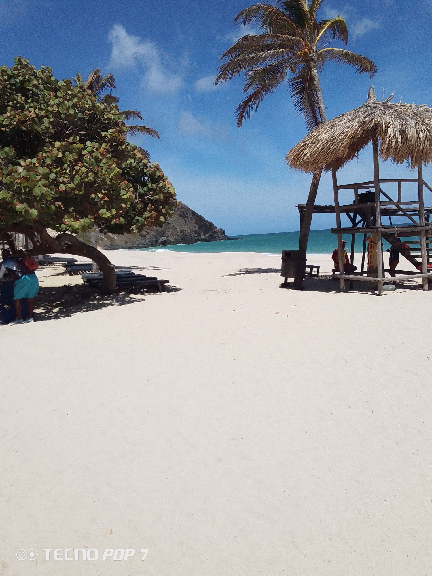 This image captures a vibrant beach scene in Pedro González, Venezuela, under a clear blue sky dotted with scattered white clouds. The foreground and mid-ground consist of vast expanses of light-colored sand. On the left side of the frame, a large, leafy green tree with a thick, curving trunk casts a prominent shadow, under which several dark beach loungers are visible. Two individuals are partially obscured beneath this tree: one wears a light blue top, blue shorts, and carries an orange shoulder bag, while another, largely hidden, has a blue object near their feet. Towards the right, a tall palm tree bearing several coconuts stands beside a multi-level wooden structure topped with a thatched roof, resembling a lifeguard stand. A dark-colored waste bin is situated near the structure's base. Two people are present near this structure: one individual, clad in a red top and red shorts, is seated on a low bench at its base, and another person, in dark clothing, is partially visible on the structure's stairs. In the background, the turquoise ocean meets the white sandy shore, displaying small breaking waves. A dark, rocky hill or mountain descends into the sea on the left horizon. The bottom-left corner of the image contains a "TECNO POP 7" watermark. The scene is illuminated by bright daylight, suggesting a sunny day.