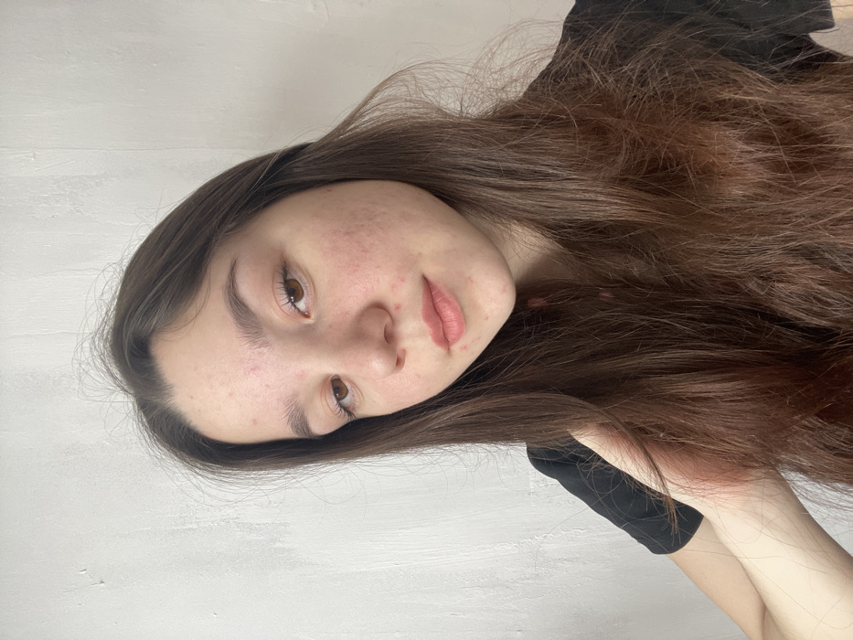 A young female with long, dark brown hair, parted on the left and falling over her shoulders, is depicted in a close-up, chest-up portrait. She faces slightly right and gazes directly forward. Her complexion is light, exhibiting visible acne and redness on her forehead, cheeks, and chin. Her eyes are brown, and her lips are closed, adorned with a light pink or peach color. She wears a black short-sleeved garment, partially visible on her left side. Her left arm is visible, with her hand positioned near her chest, partially obscured by her hair. The background is a plain, textured, light-colored wall. The scene is illuminated by soft, even lighting. The location is an interior space in the city of Ольховка, Russia.