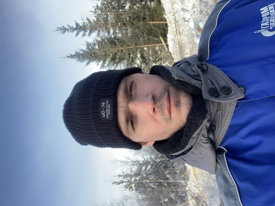 A person wearing a black beanie with a UO-76 logo, and a blue and grey jacket. The person's face is centered in the image, gazing towards the camera. The background includes snow-covered trees and a bright sky. The image is oriented vertically, with the person slightly tilted. A logo with Cyrillic text is visible on the upper right portion of the jacket. The setting appears to be outdoors during winter.