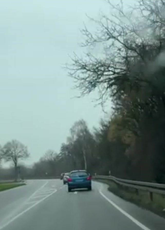 first-person perspective from inside a car driving on a paved road. The weather appears overcast, with a grey sky. The road has multiple lanes and white painted lines, including arrows indicating directions. Two cars are visible ahead, a blue hatchback in the immediate foreground and another car further ahead in the same lane. The road curves slightly to the right. The shoulder of the road is lined with a metal guardrail and trees, mostly bare of leaves, are to the right and left of the road. There are raindrops visible on the windshield.