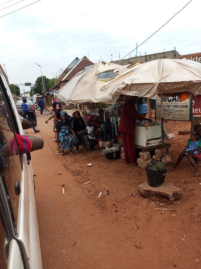 street scene in Idah, Nigeria, with a white van parked on the right side of the road. On the left side of the road, there are multiple people standing and sitting, some wearing hijabs and others in plain clothes. A man is standing behind a small food stall, and a woman is sitting on the ground with a young child. There are also several other people in the background, but they are too far away to identify. The scene is set in a busy street, with a couple of stalls and a few people walking past. There are several power lines and a building under construction in the background. The ground is dirt and dusty, and there are a couple of trash cans and other debris scattered around the street. The image was taken during the day, but the sky is partly cloudy. The image was taken in a location identified by the coordinates (latitude: 7.126, longitude: 6.748). The image seems to capture a typical street scene in Idah.